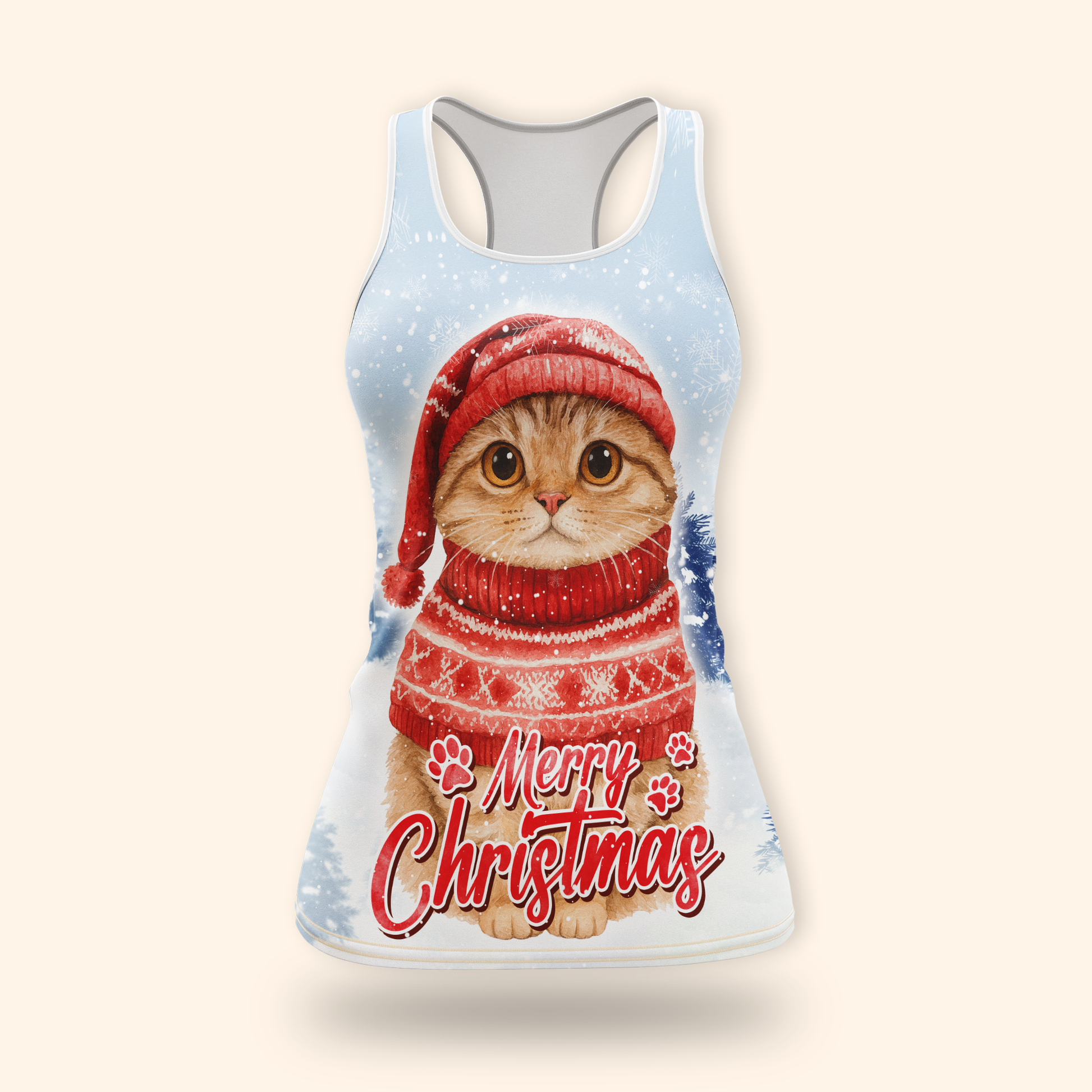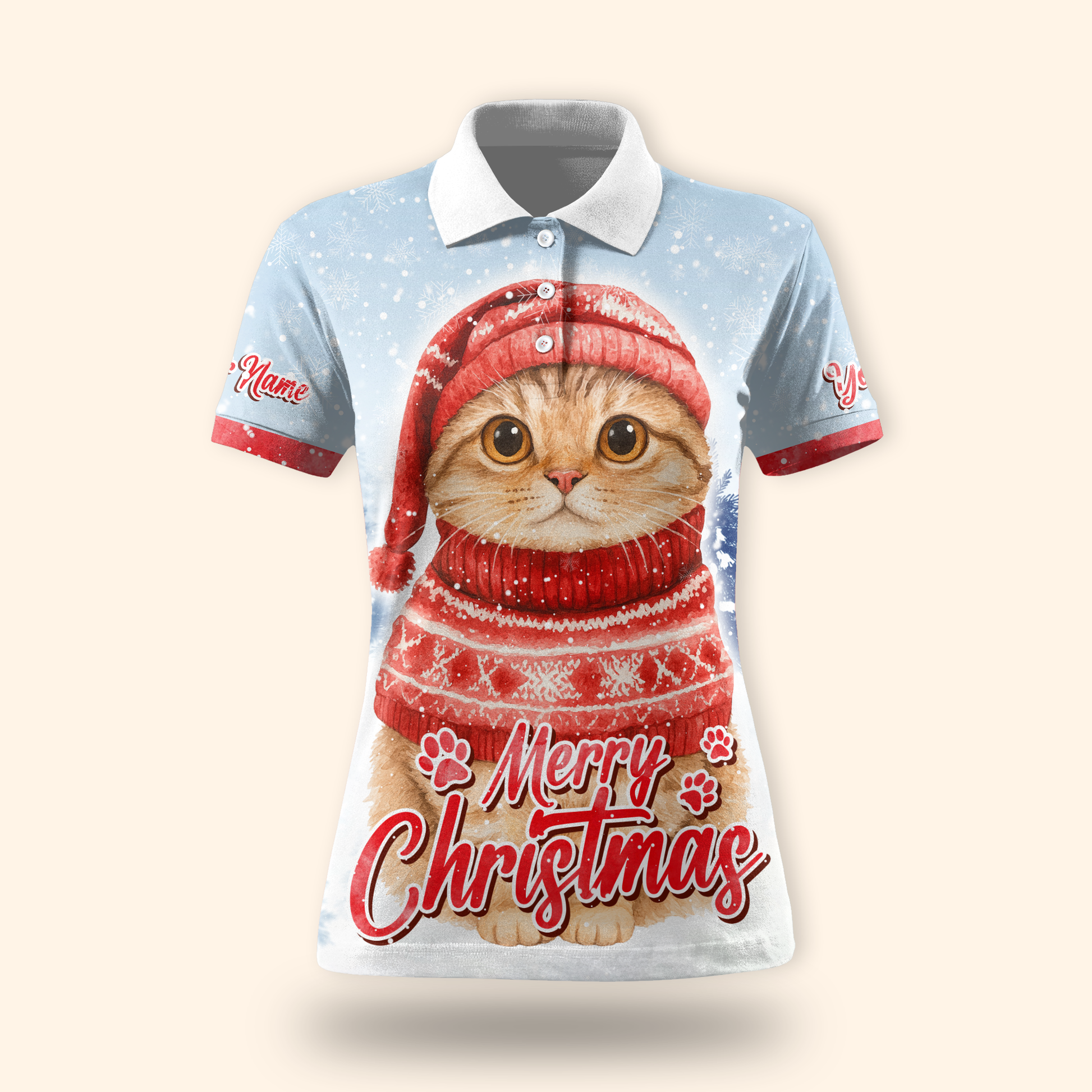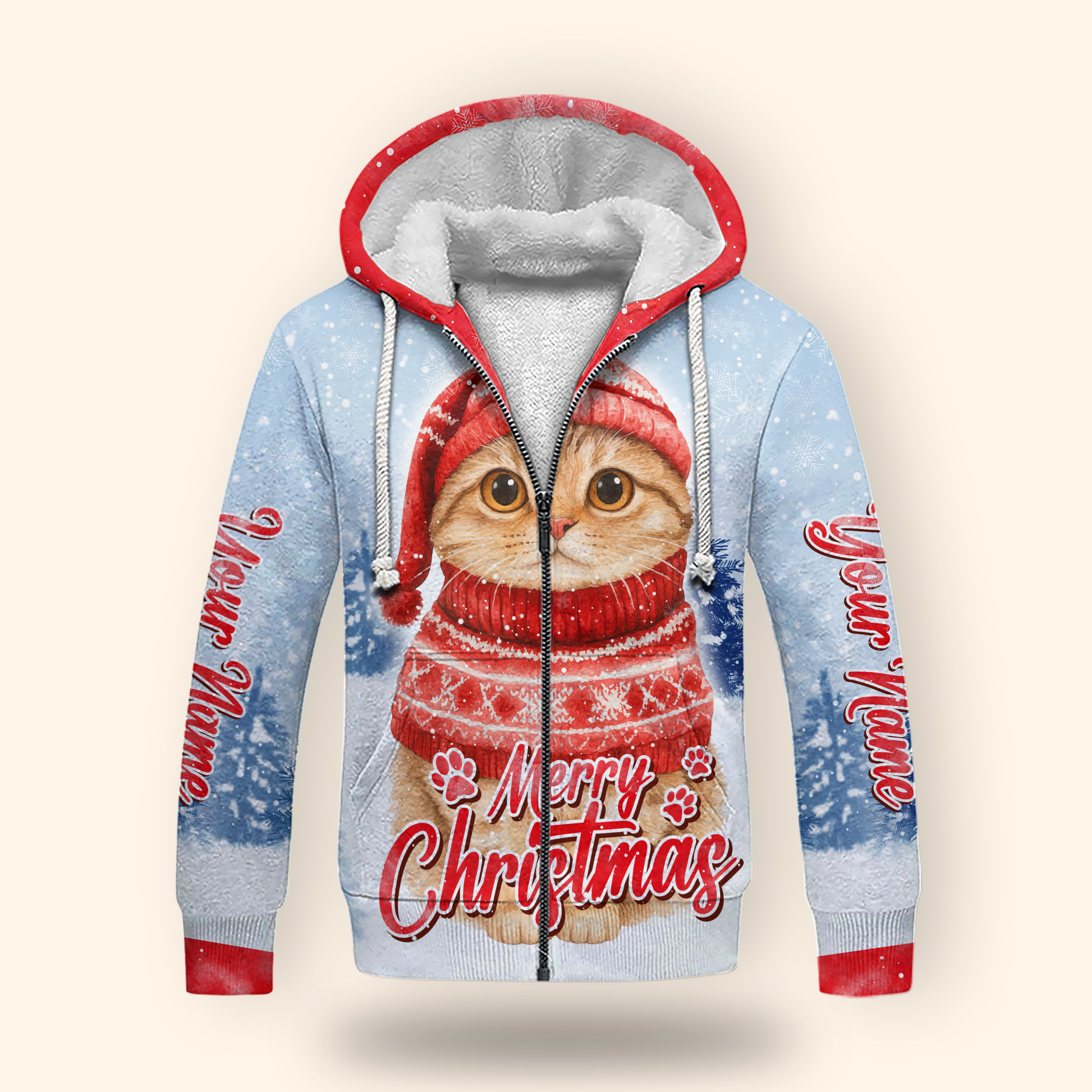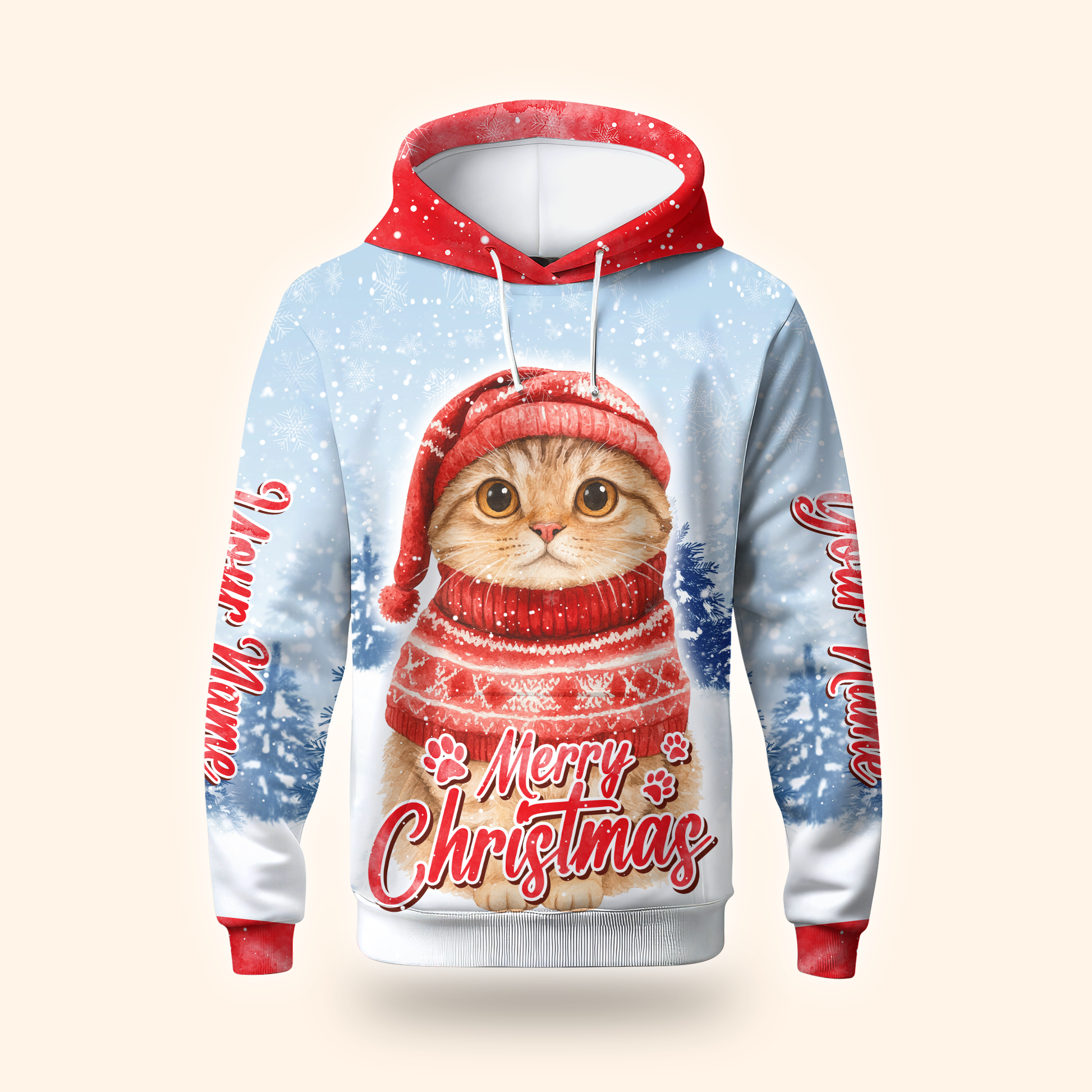 Cute Christmas Cat Hoodie – Merry Christmas Cat in Red Sweater, Personalized Name Gift