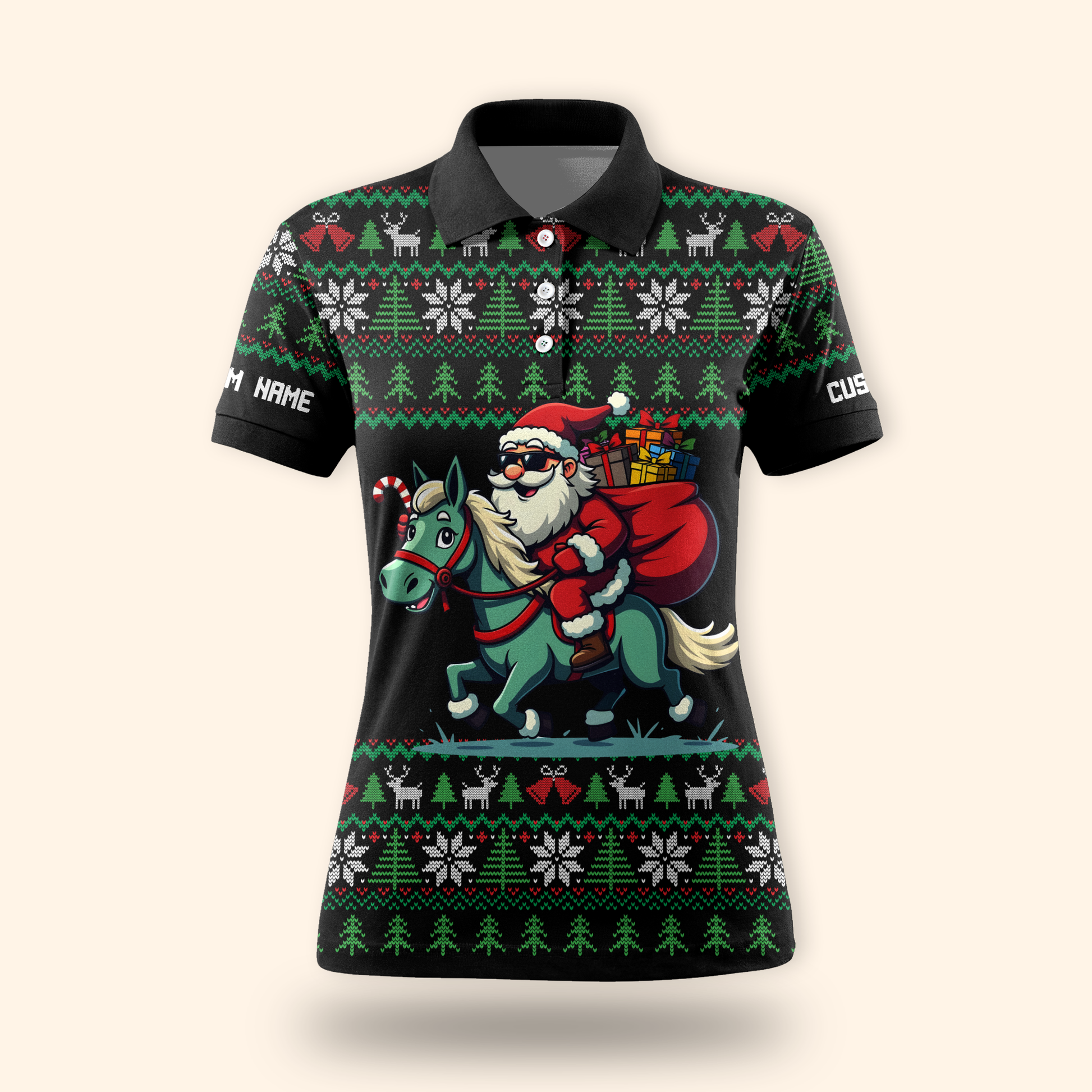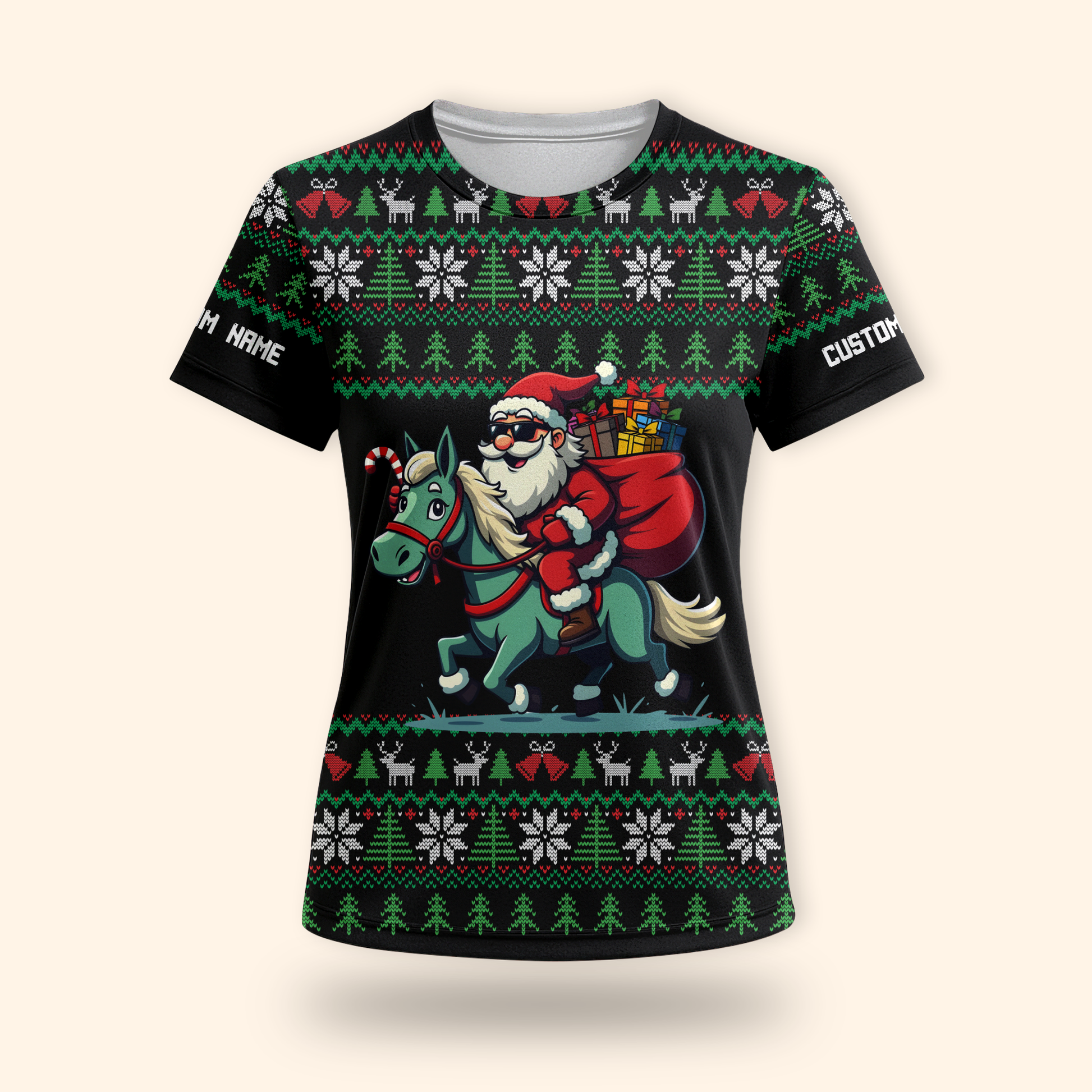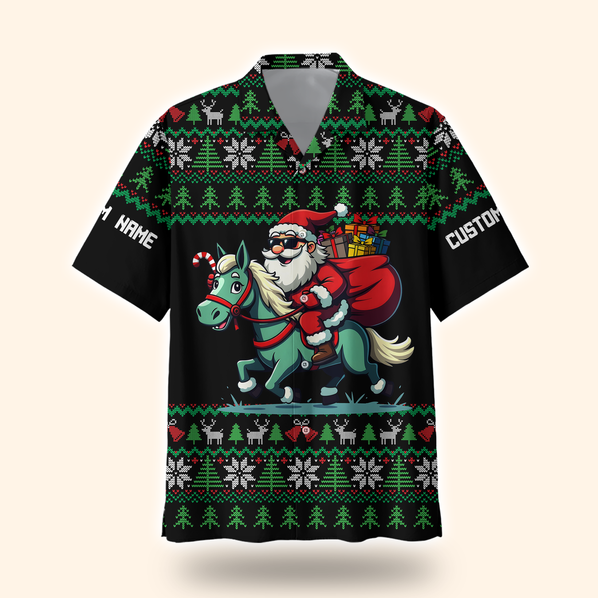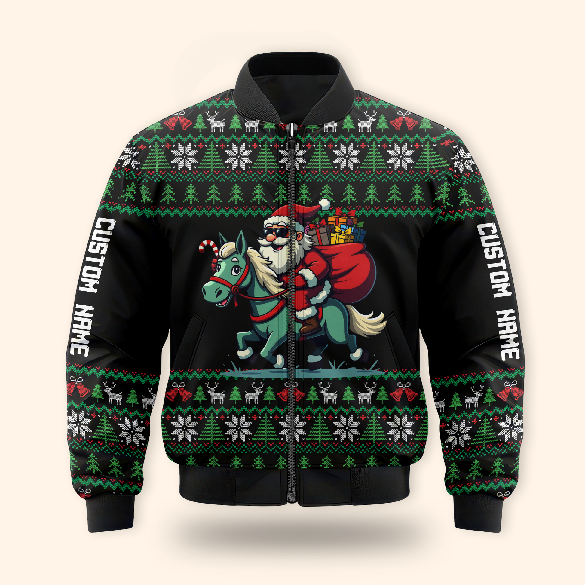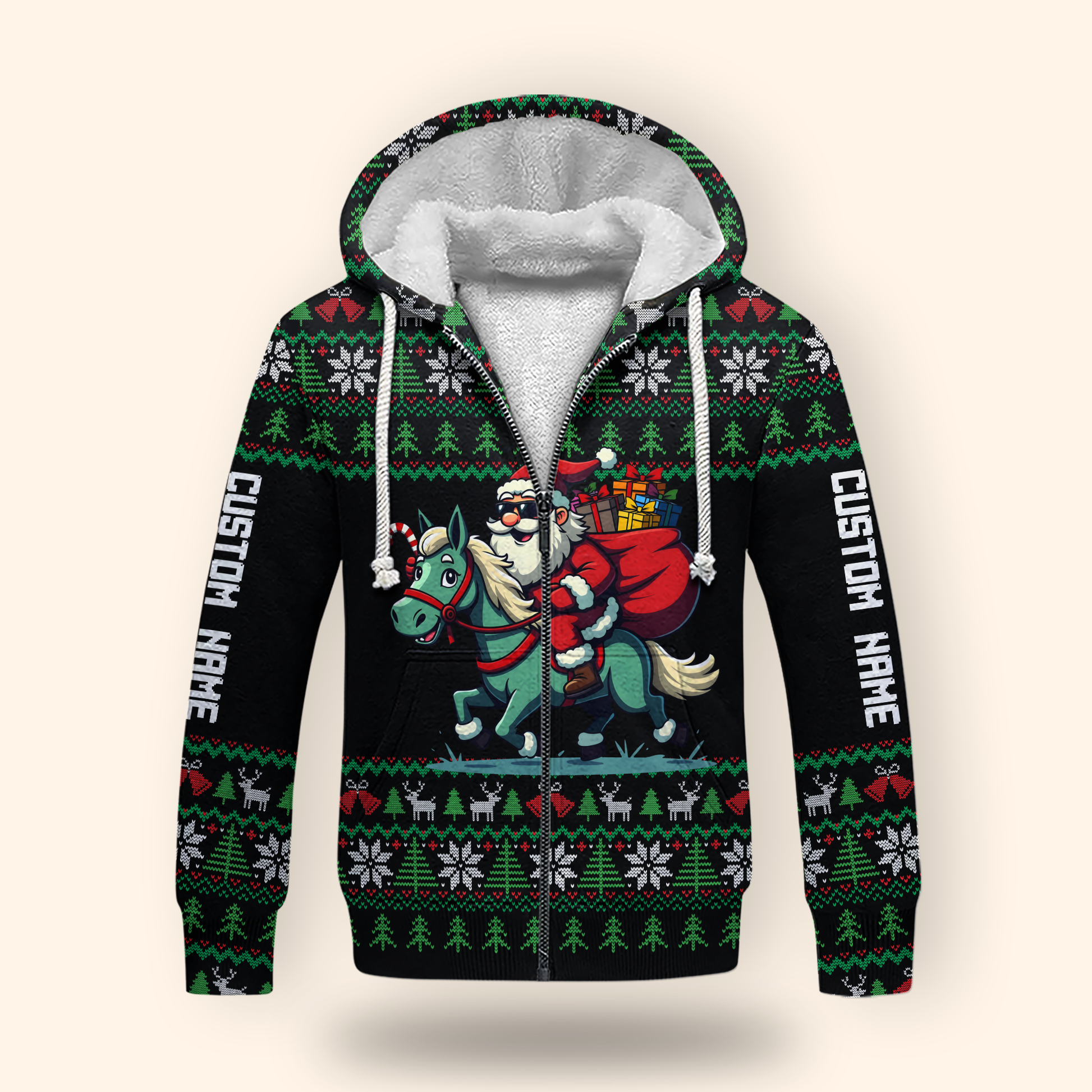 Funny Santa Riding Horse Hoodie – Custom Name Christmas Zip Up, Ugly Sweater Style, Holiday Hoodie for Horse Lovers